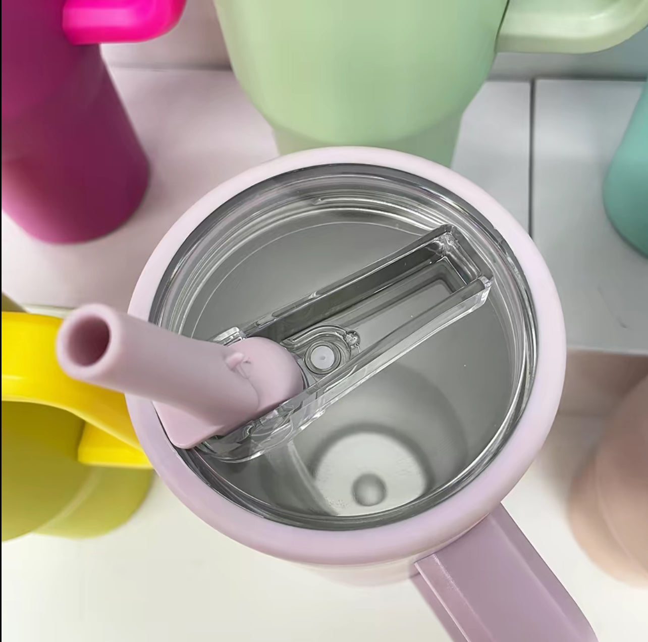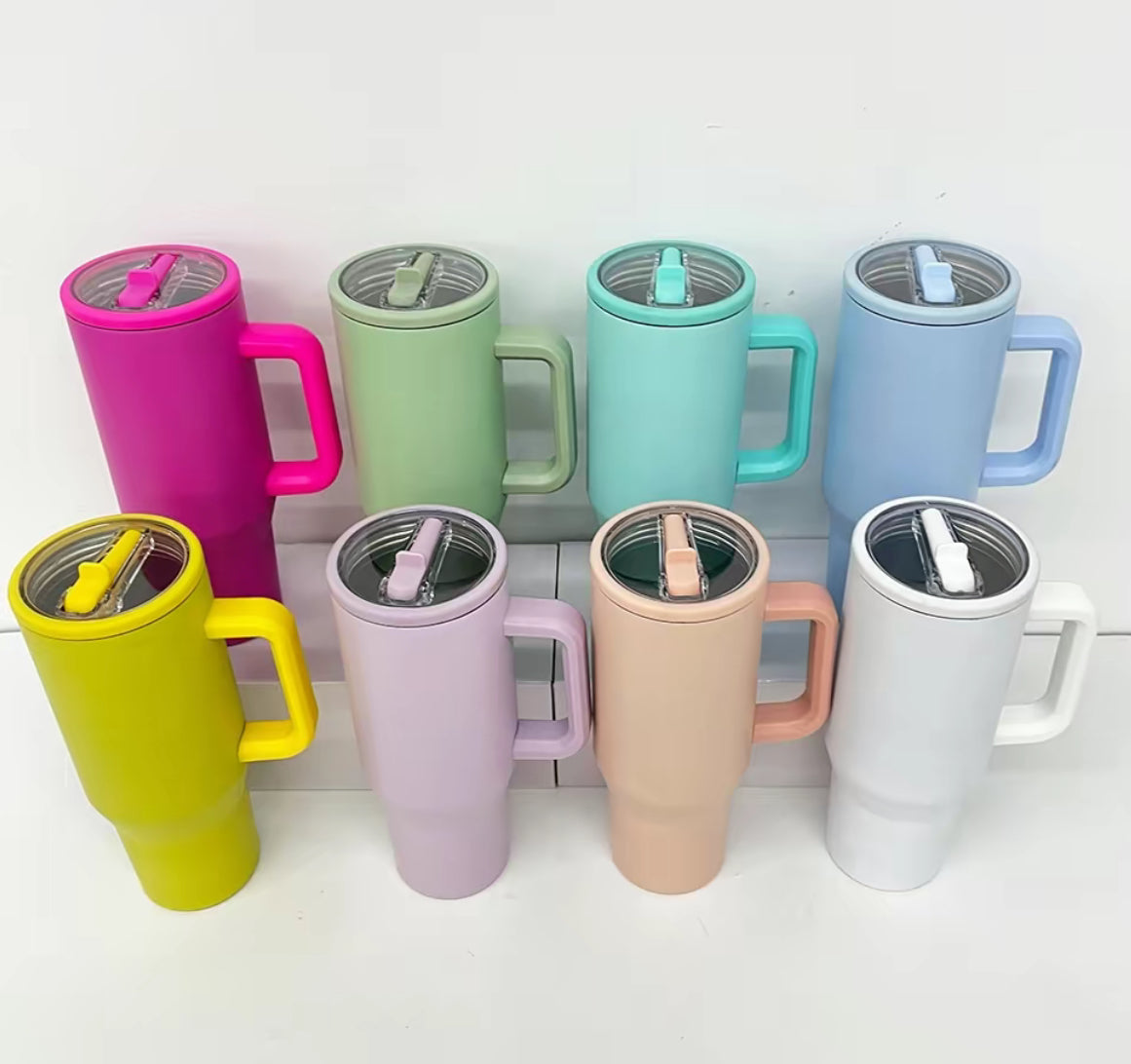 40oz. Colored flip straw stainless steel tumbler with handle and leak proof lid. 8 colors available.